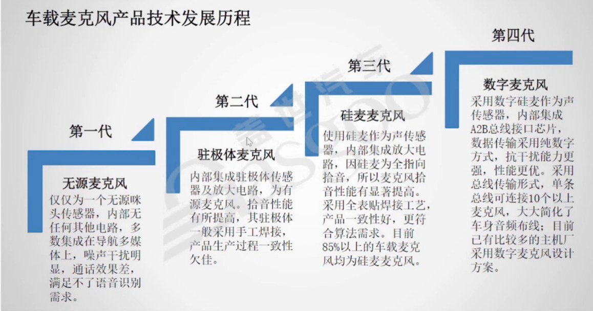1.车载麦克风产品技术发展历程:车载麦克风技术经历了多个发展阶段。第一代驻极体麦克风,内部集成驻极体传感器及放大电路,为有源麦克风,多采用手工焊接,多数集成在导航多媒体上,噪声干扰明显,通话效果差,无法满足语音识别需求。第二代硅麦麦克风,使用硅麦作为声传感器,内部集成放大电路,因硅麦为全指向拾音,麦克风拾音性能有所提高,但产品生产过程一致性欠佳。第三代数字麦克风,采用数字硅麦作为声传感器,内部集成A2B总线接口芯片,数据传输采用纯数字方式,抗干扰能力更强,性能更优。采用全表贴焊接工艺,产品一致性好,更符合算法需求。目前,85%以上的车载麦克风为硅麦麦克风,已有较多主机厂采用数字麦克风设计方案。2.数字麦克风与模拟麦克风对比:与模拟麦克风相比,数字麦克风具有诸多优势。在传输线束要求方面,数字麦克风要求较低,仅需双绞线即可;而模拟麦克风要求较高,需要使用屏蔽双绞线。抗干扰性上,数字麦克风强于模拟麦克风。组网能力方面,数字麦克风方便组网,模拟麦克风则较差。在对手件接口需求上,数字麦克风无需其他输入口,可根据A2B总线获得数据;模拟麦克风则需增加多路接口。频响范围和主动降噪表现上,数字麦克风频响范围大,有更优秀的主动降噪效果;模拟麦克风频响范围小,主动降噪有限。此外,数字麦克风体积小,适合表面贴装技术(SMT);模拟麦克风体积大,不适合SMT。