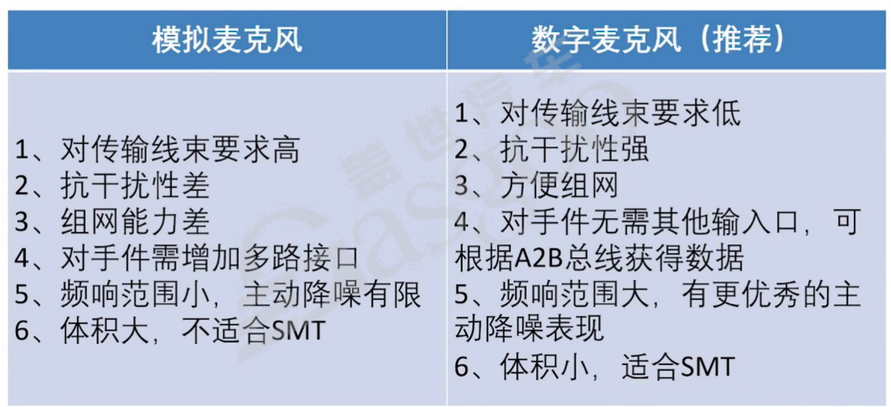 2.数字麦克风与模拟麦克风对比:与模拟麦克风相比,数字麦克风具有诸多优势。在传输线束要求方面,数字麦克风要求较低,仅需双绞线即可;而模拟麦克风要求较高,需要使用屏蔽双绞线。抗干扰性上,数字麦克风强于模拟麦克风。组网能力方面,数字麦克风方便组网,模拟麦克风则较差。在对手件接口需求上,数字麦克风无需其他输入口,可根据A2B总线获得数据;模拟麦克风则需增加多路接口。频响范围和主动降噪表现上,数字麦克风频响范围大,有更优秀的主动降噪效果;模拟麦克风频响范围小,主动降噪有限。此外,数字麦克风体积小,适合表面贴装技术(SMT);模拟麦克风体积大,不适合SMT。