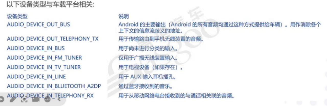 与车载平台相关的设备类型包括AUDIO_DEVICE_OUT_BUS(Android主要输出,用于消除信息流歧义)、AUDIO_DEVICE_OUT_TELEPHONY_TX、AUDIO_DEVICE_IN_BUS、AUDIO_DEVICE_IN_FM_TUNER、AUDIO_DEVICE_IN_TV_TUNER、AUDIO_DEVICE_IN_LINE、AUDIO_DEVICE_IN_BLUETOOTH_A2DP(通过蓝牙接收的音乐)、AUDIO_DEVICE_IN_TELEPHONY_RX(从移动网络电台接收的通话相关音频)。车机上常用AUDIO_DEVICE_OUT_BUS,录音功能则需根据具体配置选择合适的设备类型。