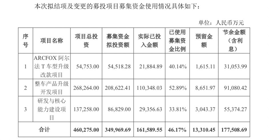 其中,对ARCFOX阿尔法T车型升级改款项目、整车产品升级开发项目、研发与核心能力建设项目三大项目进行了终止、调整以及结项。