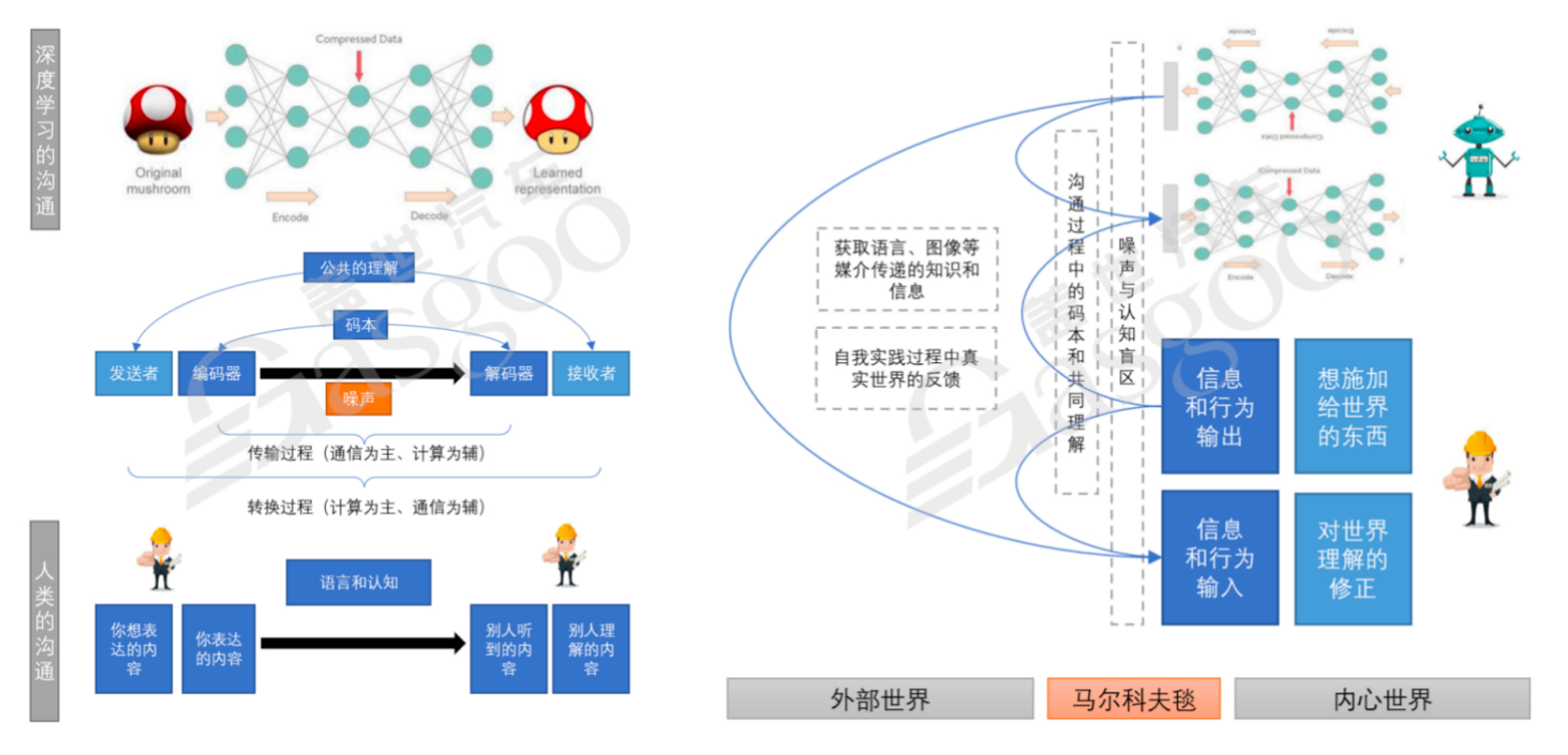 人与机器的沟通分为两种类型。一种是语言协作和多媒体类的沟通,如ChatGPT与用户之间的交互;另一种是脑机接口的转换。脑机接口具有更大的无损性,但同时也带来了人机耦合性的提升,目前其发展仍处于探索阶段。而机器与机器之间的沟通,除了明文沟通外,更多的是进行最优化和模型内部的转化过程,这些不同的沟通方式各自具有特点和应用场景。