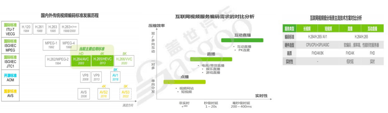 自1992年起,陆续制定了多种视频编码标准。早期的MPEG-1标准广泛应用于VCD制作,MPEG-4标准用于交互式和移动多媒体通信。之后,ITU-TVCEG专家组联合MPEG专家组推出了H.262/MPEG-2、H.264/MPEG-4Part10/AVC、H.265/HEVC和H.266/VVC等多代视频编码标准,逐渐成为全球视频压缩应用的主流标准。2015年,亚马逊、思科等科技巨头创立开放媒体联盟(AOM),推出全新、开源、免版税的视频编码技术。我国的AVS3于2022年投入应用,未来我国传统视频编码标准将形成以H.265为主,AV1、AVS为辅的协同发展格局。不同的视频编码标准在压缩效率、实时性等方面存在差异,适用于不同的应用场景,如直播、点播、互动直播等对编码标准的要求各不相同。