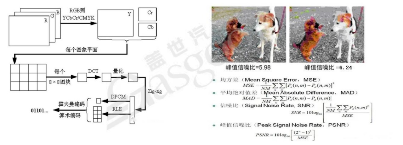 为了去除图像中的冗余信息,采用了多种压缩算法,如变换编码、预测编码等。这些算法旨在寻找图像数据的规律,构建高效的模型。在实际应用中,判断压缩算法的优劣通常采用客观评价和主观评价两种方式。客观评价主要通过计算“信噪比/峰值信噪比”等指标来衡量,例如计算均方差(MSE)、平均绝对值差(MAD)等。主观评价则依赖人对图像质量的直观感受。此外,图像在编码过程中,一般会将图像切割为“块”或“宏块”(通常为16像素×16像素)进行计算,以提高计算效率。