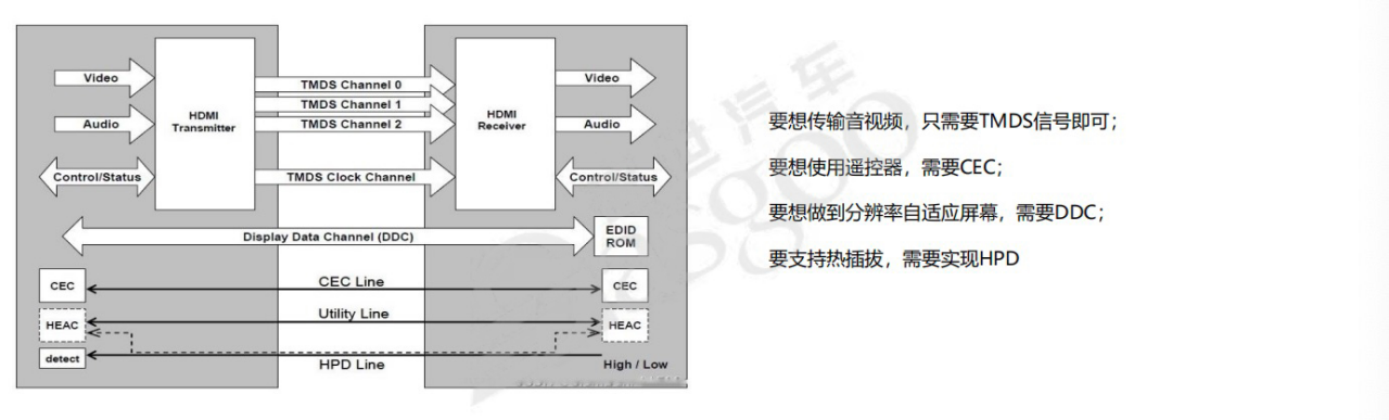HDMI(高清多媒体接口)支持在单线上传输全数字高清视频和多声道音频,基于TMDS协议传输,主要用于音视频source到sink设备的传输,向下兼容DVI,但DVI只能传输视频。HDMI有A、B、C、D、E五种引脚类型,常用的Type A接口包含用于传输数据的TMDS data引脚、用于时钟传输的TMDS clock引脚,以及用于遥控的CEC引脚、用于分辨率自适应的DDC引脚、用于热插拔检测的HPD引脚等。