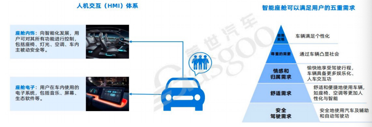 智能座舱主要涉及座舱内饰和座舱电子领域,可满足用户的多重需求,包括自我实现、尊重、情感和归属、舒适以及安全需求。它由软件、硬件和人机交互技术组成。