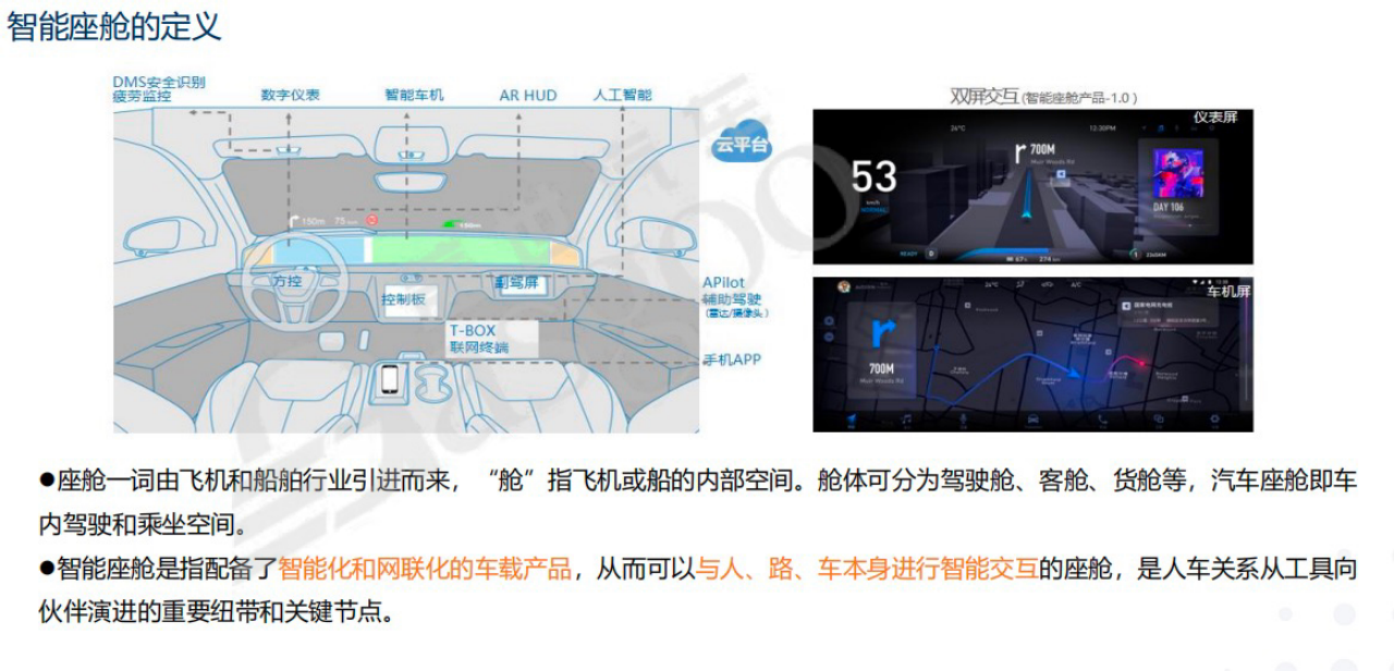 智能座舱的概念源自飞机和船舶行业,是车内驾驶和乘坐的空间。配备智能化和网联化车载产品的智能座舱,可实现与人、路、车的智能交互,是推动人车关系从工具向伙伴转变的关键环节。