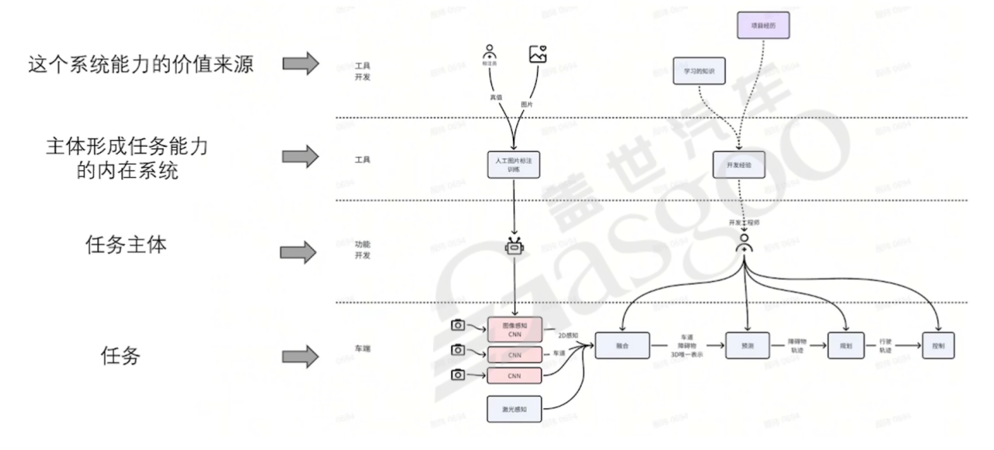 在模型训练方面,规则算法、传统监督式学习和大模型训练各有特点。规则算法在时间维度上的提升具有线性优势,在软件架构的初期,规则算法能够快速实现一定的功能提升。但随着技术的发展,其局限性也逐渐显现,后期提升过程中波动性较大。传统的监督式学习在构建数据闭环时面临挑战,并且需要投入大量的人力资源进行数据标注,走到一定阶段后,由于标注成本等问题,其发展也会受到限制。而大模型采用半监督半自主的训练逻辑,通过生成模型来训练鉴别模型。