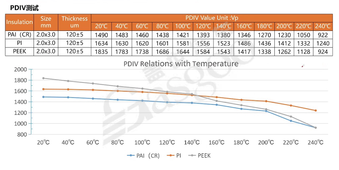 PDIV(局部放电起始电压)测试是评估绝缘材料性能的重要手段之一。通过对PAI(CR)、PI、PEEK等材料在不同温度下的PDIV测试发现,不同材料的PDIV值随温度变化呈现不同趋势。例如,在20°C - 240°C的测试温度范围内,PAI(CR)、PI、PEEK的PDIV值各有差异,且从室温到高温,其衰减斜率也不尽相同。在选材时,需综合考虑材料在不同温度下的PDIV值以及衰减情况,一般电机运行温度在160 - 180°C之间,所选材料在此温度区间应能满足绝缘要求。