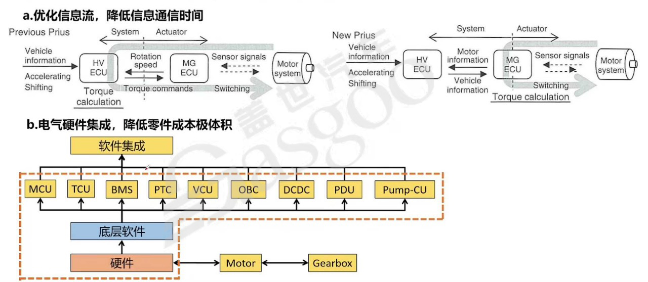 在软件集成方面,优化信息流是关键。以丰田普锐斯方案为例,通过将通信流从原先经过HV(混合动力车辆)的复杂过程转移到电机MCU上,简化了信息流,缩短了信息通信时间,将部分判断功能从上位机直接转移到执行单元,提升了系统响应速度和运行效率。