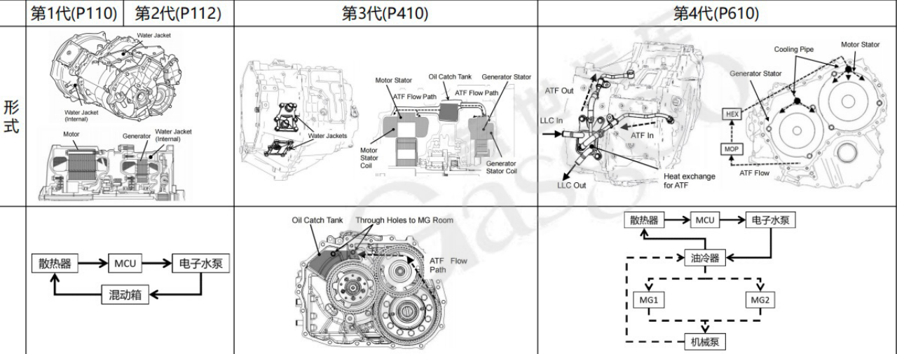 从标杆机的拆解分析来看,丰田的热管理系统表现较为出色。丰田混动系统历经五代发展,前两代采用电子水泵,通过混动箱、散热器,再经过 MCU,中间部分采用水道冷却。第三代则完全采用油冷方式冷却电机,水冷主要用于 MCU。第三代和第四代又根据不同的混动车型(HEV 和 PHEV)细分了版本,冷却方式也有所差异。例如,第三代通过差速器绕到中间齿轮轴,再利用油槽高度差进行冷却;第四代在轴部分增加了轴心润滑油道,进一步提升了冷却效果。