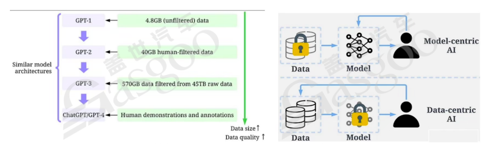 在大模型的发展过程中,Data-centric(以数据为中心)的理念逐渐兴起。与传统以模型迭代为主(Model-centric)的AI开发方式不同,大模型的成功很大程度上依赖于大量高质量的数据以及对数据引擎的重视。以GPT系列模型为例,从GPT-1到GPT-4,模型结构基本保持Transformer解码器不变,主要是通过扩大模型规模和数据规模来提升性能,这是典型的Data-centric过程。