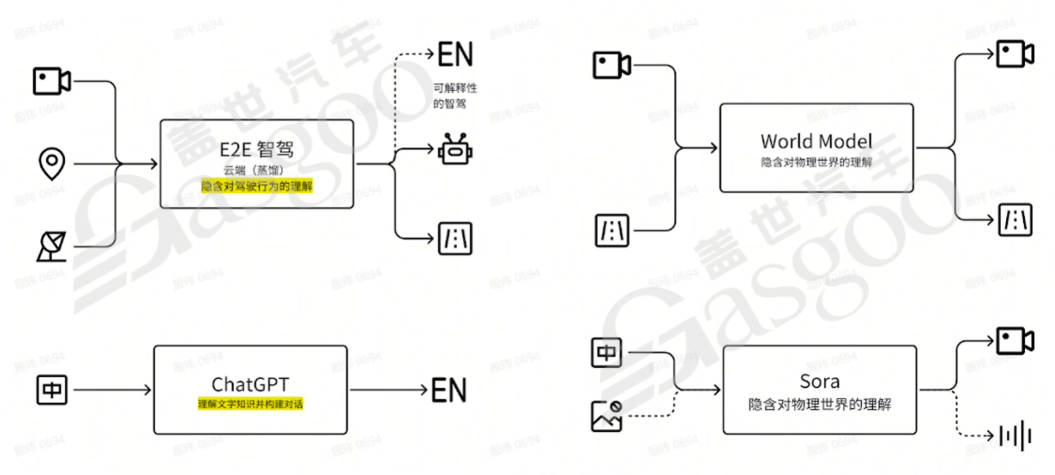 从参数量来看,一般常用图像模型参数量在1000万-5000万,车端的端到端模型一般在1-3亿,而真正的大模型则达到百亿千亿级别,如ChatGPT。不同类型的大模型在处理任务上也有所不同。例如,将视觉定位、矢量信息、雷达原感知信息作为输入,以语言、执行指令等矢量作为输出,构成端到端模型;视频和矢量进出的属于World Model范畴;语言进、视频或声音出的类似Sora;ChatGPT则以语言进、语言出为主,如今也逐渐向多模态拓展。这些模型虽应用于不同业务领域,但都采用Transformer结构,这与过去模型结构多样、数据固定的情况截然不同。