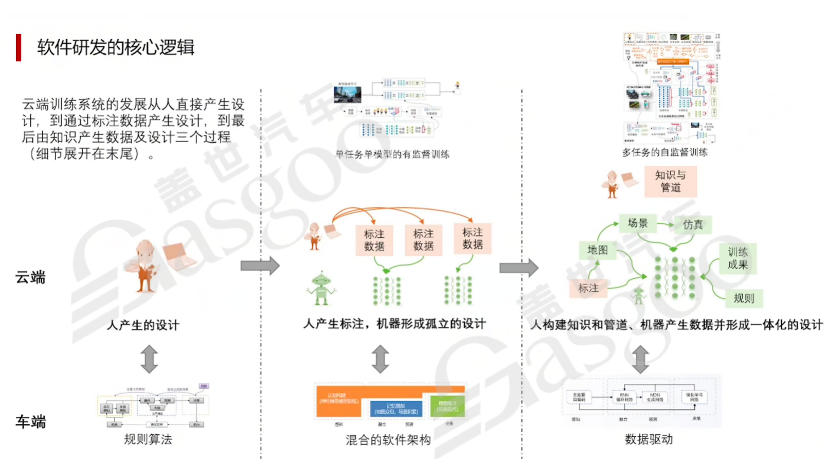 在技术飞速发展的当下,软件领域正经历着深刻变革,从第二阶段迈向第三阶段的过程中,对灵活性的追求达到了新高度,软件自主升级成为关键趋势。以特斯拉软件版本迭代为例,从V10到V12的演进,其软件架构图发生了显著变化。下图中绿色部分代表规则算法,红色部分代表感知算法,随着版本更新,红色部分占比逐渐增多,绿色部分重要性不断降低。到V12时,整个模型执行过程基本以网络模型为主,仅保留少量显示代码。这一变化反映出特斯拉在软件迭代中,不断强化神经网络模型的应用,逐步减少对传统规则算法的依赖,以提升软件的智能化水平。