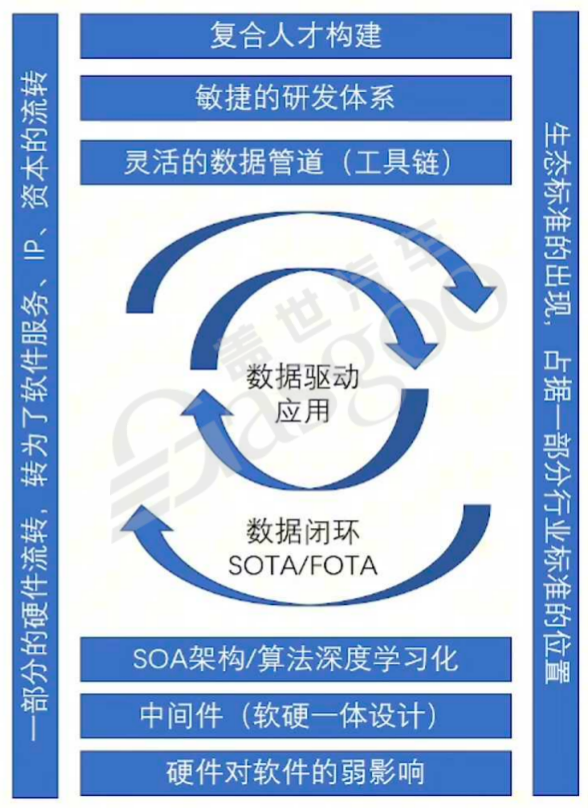 其次,生态标准逐渐取代行业标准。这一变化反映了汽车行业与互联网行业在标准理解上的差异,对汽车行业的发展产生了深远影响。再者,软硬件协同开发思路发生了整体调整。硬件对软件迭代的影响逐渐削弱,更加注重软硬件的一体设计。在芯片领域,芯片与算力之间的耦合性成为关键因素,其耦合程度的提升能够带来近百倍的性能差距。同时,算法的模型化、云端数据驱动的业务设计、研发流程的优化以及复合型人才的培养,都成为新研发方法论的重要组成部分。复合型人才的构建尤为关键,这意味着对工程师的要求越来越高,他们需要具备跨领域的知识和技能,以应对日益复杂的汽车研发工作。