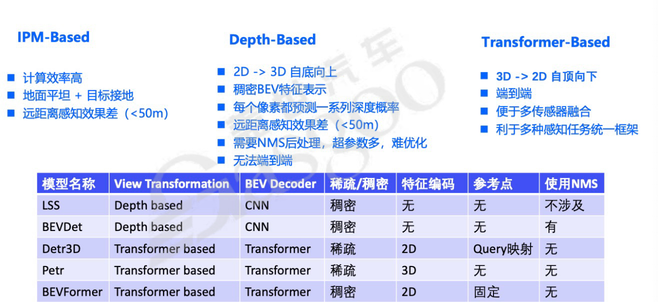3. Transformer方法:Transformer方法是当前的主流方案,它是一种自顶向上的方案,通过query和attention机制直接从全局信息预测动态或静态结果。该方法具有诸多优势,如易于实现端到端、便于多传感器融合、可将地图信息融入网络以扩大感知范围和精度等。