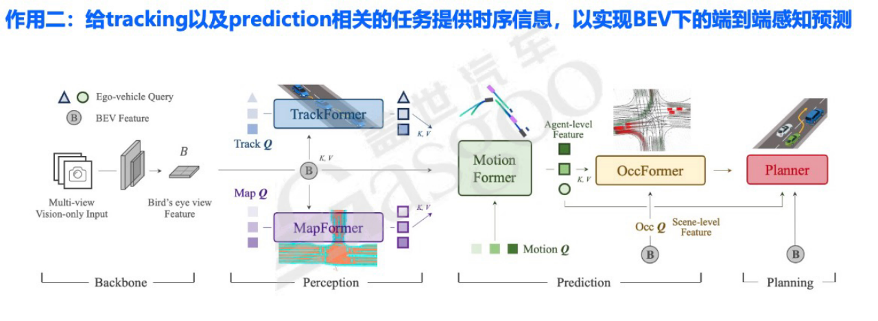 BEV时序融合最初用于解决遮挡问题,通过利用历史信息,使网络能够判断被遮挡物体的存在。在端到端的自动驾驶系统中,不同阶段(如tracking、prediction和planning)都需要时序信息。例如,tracking需要时序上的关联来跟踪目标物体,prediction则依赖当前及历史信息预测未来物体的轨迹和状态。