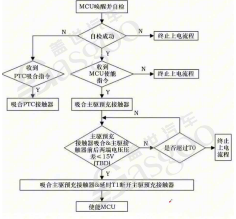 此外,MCU在接收到停止使能请求后,会将扭矩清零,停止使用MCU,同时断开主驱接触器,进行主动放电,并检测主驱/主驱预充接触器粘连情况,存储接触器状态。主动放电完成且粘连检查完毕后,确认MCU无唤醒信号,使MCU延迟或休眠。期间,若收到PTC断开指令,也会相应断开PTC接触器。