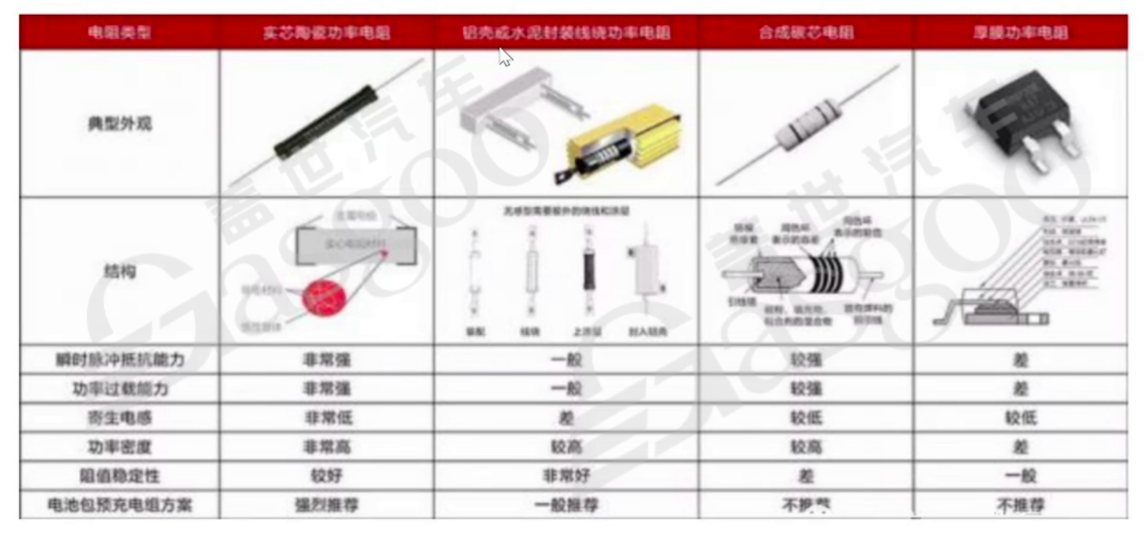 预充电阻类型多样,不同类型在瞬时脉冲抵抗能力、功率过载能力、寄生电感、功率密度和阻值稳定性等方面存在差异。