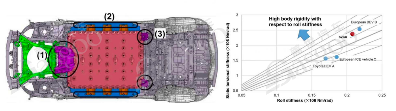 车身结构设计旨在碰撞时保护乘员、高压元件和行人。将电池组安装在地板下,并与周围坚固的框架结构连接,可实现高刚性车身。虽然纯电动汽车因大容量电池组更重,但通过实现低重心和低惯性矩,优化前后顺应转向特性,可提升动态性能质量。