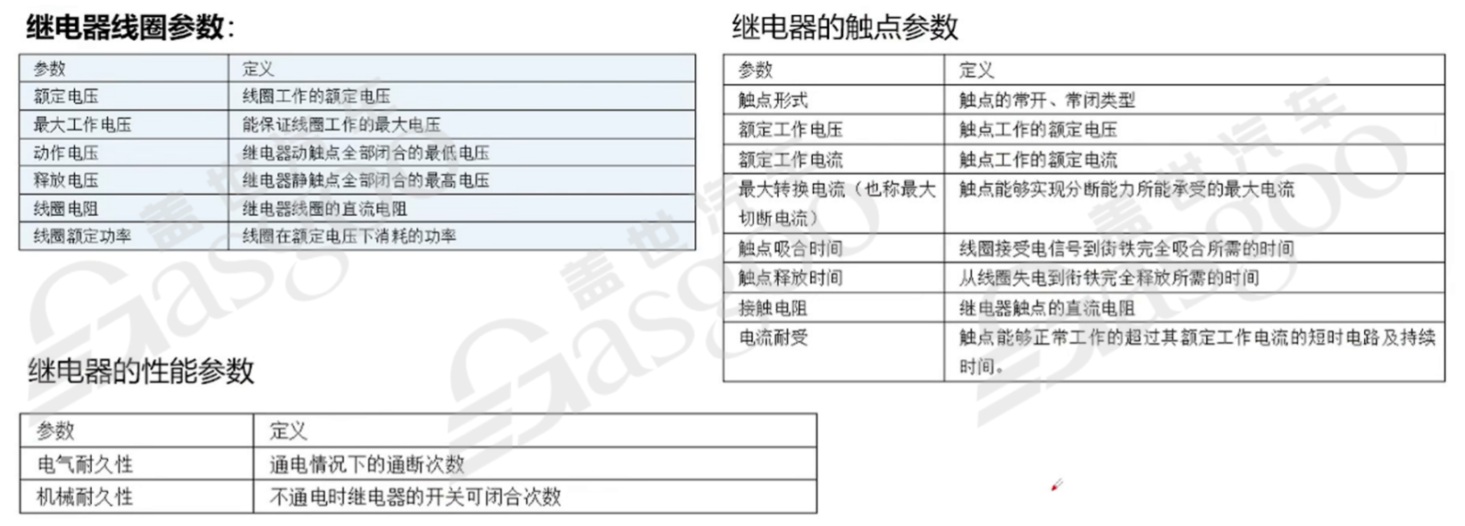 继电器的参数众多,包括线圈参数和触点参数。线圈参数主要有额定电压、最大工作电压、动作电压、释放电压、线圈电阻和额定功率。额定电压是线圈工作时的标准电压,最大工作电压是能保证线圈正常工作的最高电压,动作电压是继电器动触点全部闭合时的最低电压,释放电压是继电器触点全部断开时的最高电压,线圈电阻为继电器线圈的直流电阻,额定功率是在额定电压下的消耗功率值。