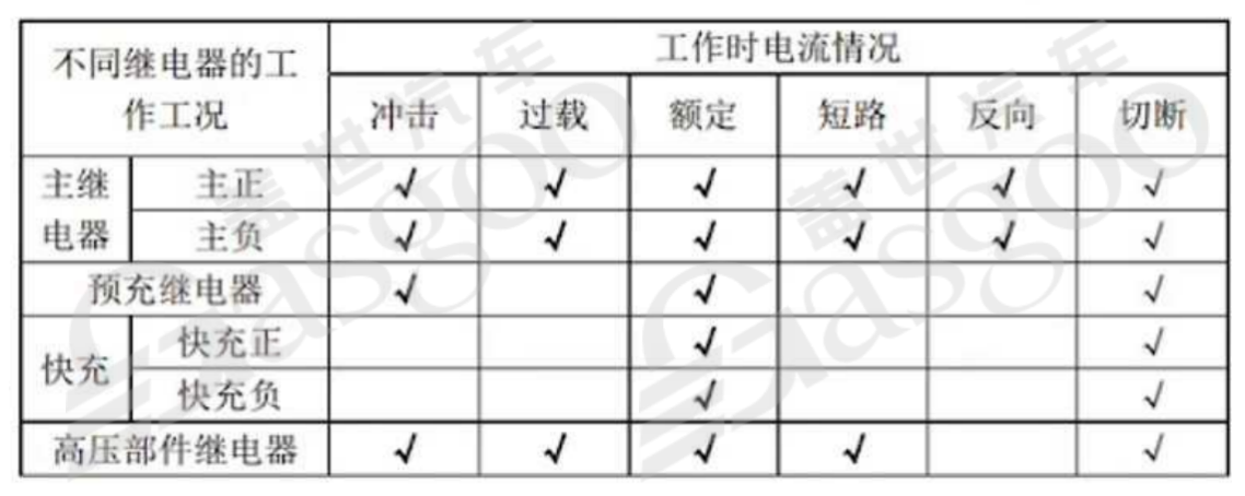 继电器在电路中所处位置不同,工作工况也不尽相同。常见的工作工况包括冲击、过载、额定、短路、反向和切断等。不同类型的继电器,如主正继电器、主负继电器、预充继电器、快充正继电器、快充负继电器和高压部件继电器等,在不同工况下的电流耐受需求各异。