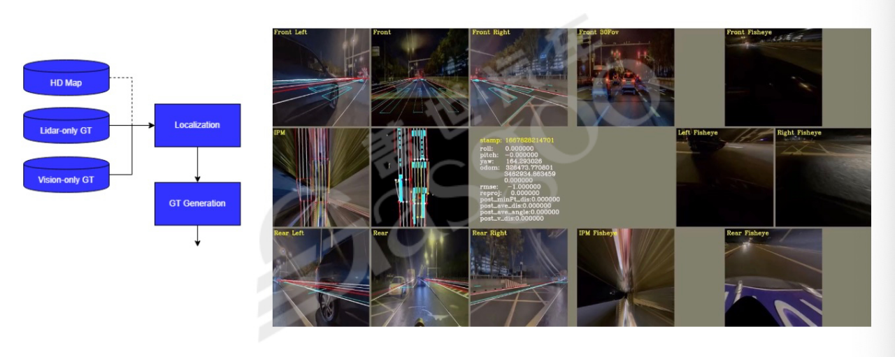 雨雪天、夜晚等特殊场景下,由于激光雷达点云失效,难以直接标注。此时,利用晴天建图数据,通过定位方法为这些场景生成真值,避免了重建图模糊无法标注的问题。但在使用定位生成真值时,需注意真值与图像要素的对齐精度以及数据筛选,确保真值的可靠性。