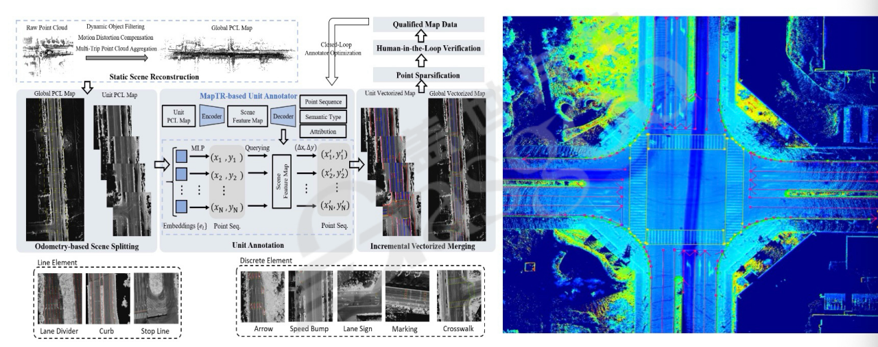 泊车场景标注具有独特性,由于缺乏GPS信号,无法进行传统聚合。因此,通常进行完整采集并构造回环以保证定位精度。在泊车场地图重建中,需检测地库的关键要素(如斑马线、减速带、柱子、库位点等),对定位精度要求极高(误差小于5厘米),以避免泊车刮蹭。