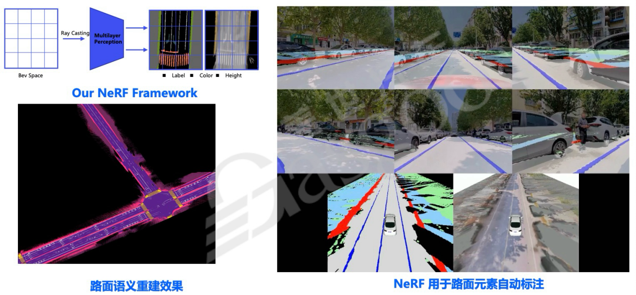 1.路面标注技术:路面标注技术路线是采用76V或7V同步,结合轮速IMU和GNN信息进行刷分模式重建。由于纯视觉重建缺乏尺度信息,先利用轮速IMU和GNN融合得到带真实尺寸的轨迹,再通过相似性变换赋予刷分模式重建结果尺度。之后,利用稀疏点和其他约束进行路面数字化,采用Nerf方法重建路面。