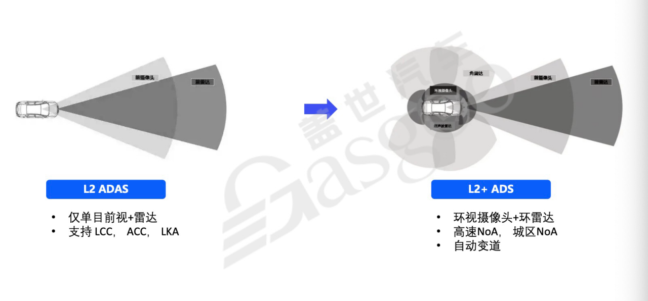 从L2到L2+阶段,自动驾驶车辆的传感器布局发生显著变化。L2阶段的ADAS通常配备单目前视摄像头和前置毫米波雷达,足以支持车道居中控制(LCC)、自适应巡航(ACC)和车道保持辅助(LKA)等功能。而L2+阶段,为实现高速NOA和城区NOA,车辆需增加环视摄像头、周视摄像头,前视摄像头数量也可能增多。