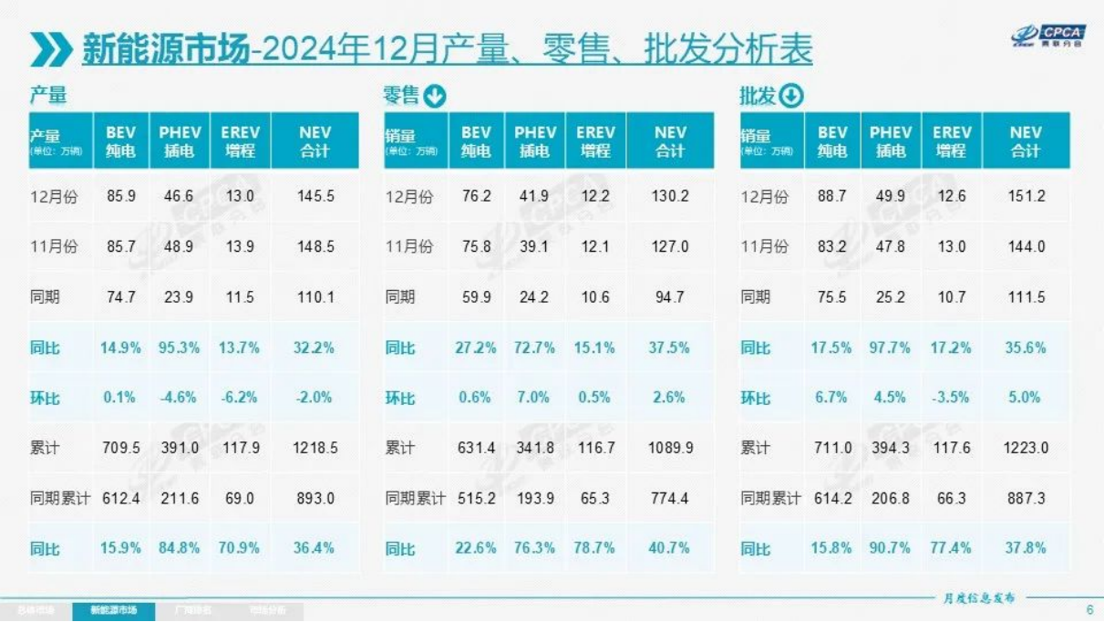 譬如,共生产新能源车1,218.5万辆,同比增长36.4%;譬如,新能源车批发销量达到1,223.0万辆,同比增长37.8%;再譬如,新能源车零售销量达到1,089.9万辆,同比增长40.7%。
