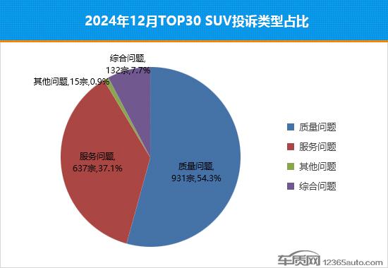 据乘联会提供的全国汽车产销数据显示,2024年12月份国内SUV市场累计零售销量134.6万辆,环比上涨12.1%,同比上涨16.3%。同期,车质网受理车主针对SUV的有效投诉6,773宗,环比上涨28.3%,同比上涨6.3%。去除投诉人自愿申请撤诉的信息后,2024年12月TOP30 SUV销量投诉量排名如下: