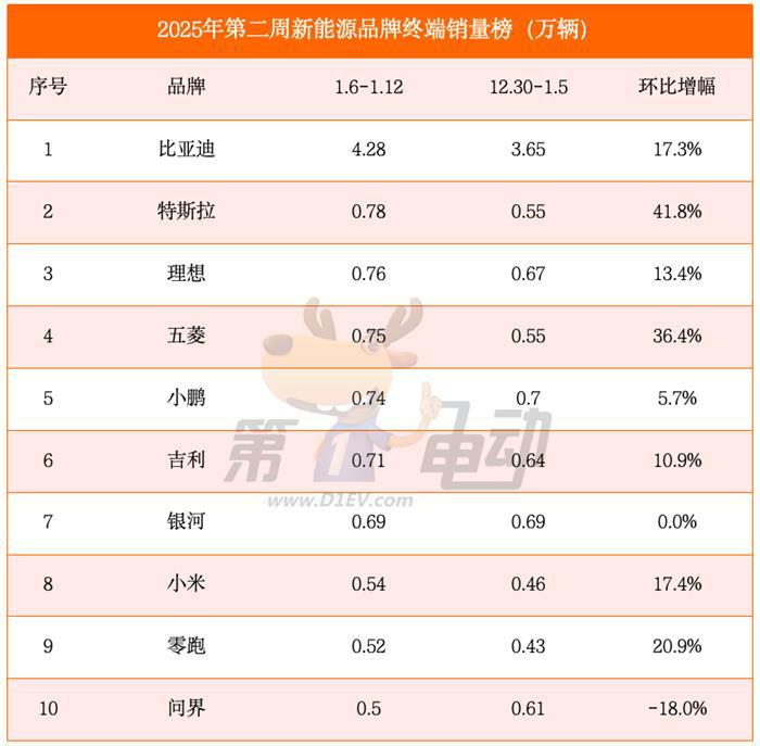 在经历了首周销量下滑后,2025开年第二周(1.6-1.12)新能源车市回暖。