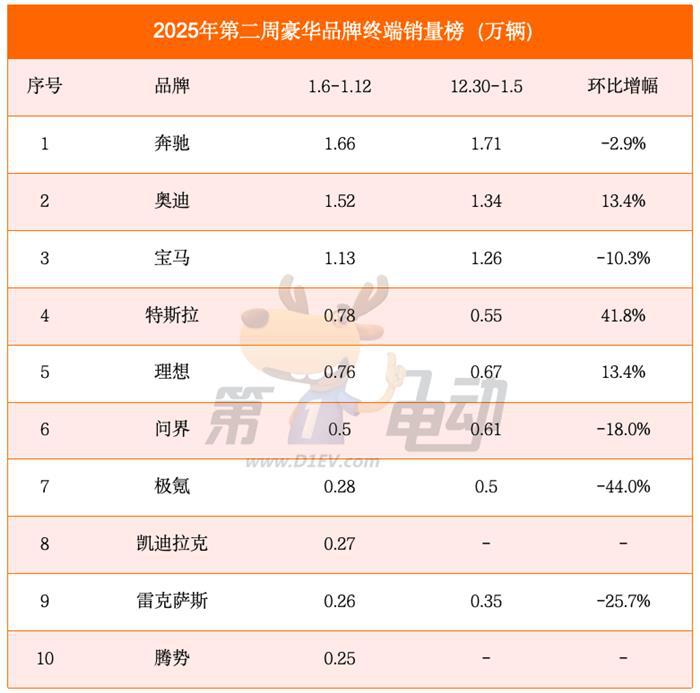豪华车市场仍然是BBA的天下。1月第二周,BBA再次超越特斯拉、理想、问界位居榜单前三。