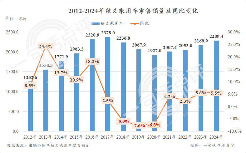 虽然,2024年没能如2016年和2017年那般达到2300万辆以上,可其是2019年以来首次再度超过2200万辆,而且也取代了2018年的2236.8万辆成为国产狭义乘用车历史上仅次于前两者第三高的年度成绩。