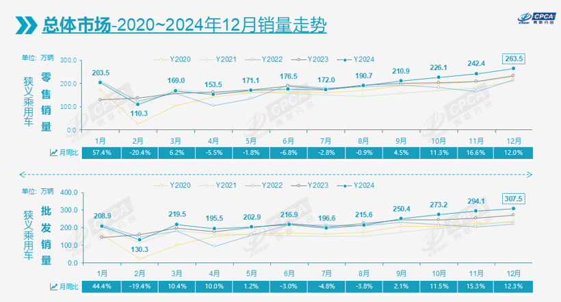 与此同时,伴随着国内零售市场的走强,加上国内车企在海外市场的不断扩张,2024年国产狭义乘用车的批发销量更是以2719.1万辆刷新有史以来的最高纪录。其中,12月的307.5万辆是批发市场单月首次超过300万辆。