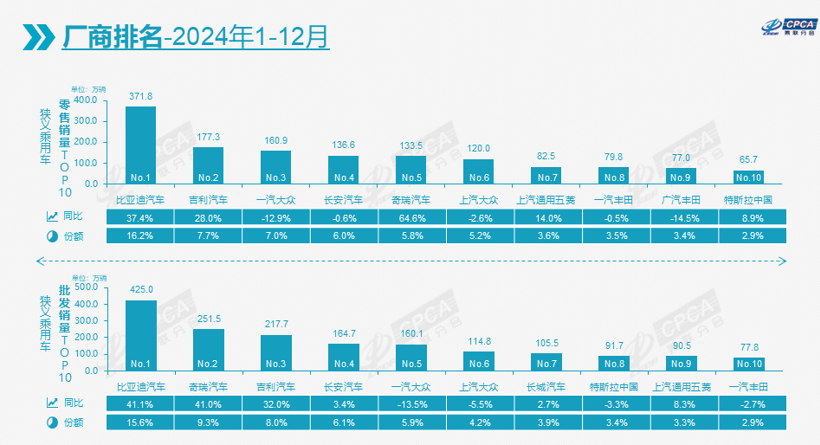 以2024年的国产狭义乘用车零售和批发销量车企十强榜单来看,比亚迪以371.8万辆和425.0万辆再次同时摘得两者的冠军头衔,成为国内第一家在两个市场年销量都超过300万辆的车企。而且比亚迪的批发销量还超过了400万辆,这是中国汽车行业历史上史无前例的成绩。