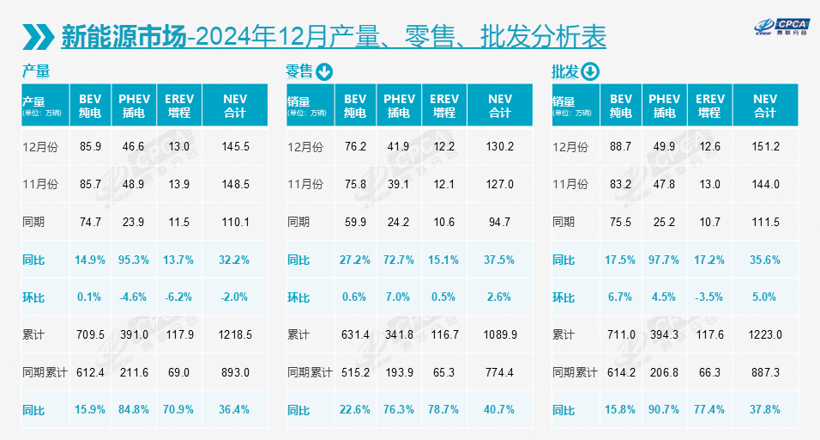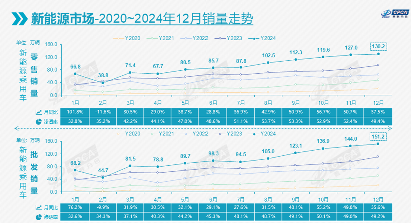 受到传统燃油车的反攻,加上部分新能源车企可能为了2025年1月的开门红隐藏部分销量的影响,去年12月国内新能源零售的渗透率再度回落至49.4%,但凭借7月至11月创造的巨大优势,2024年全年的渗透率也达到47.6%,同比增加12.0个百分点。