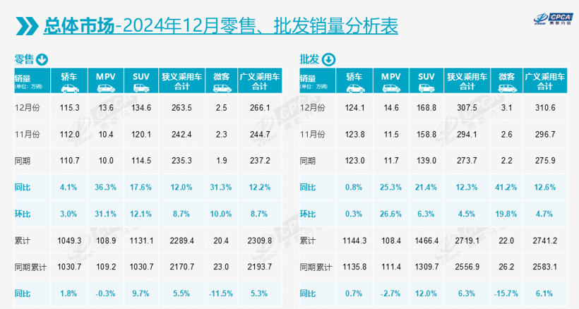 再从以车身形式区分的传统三大细分领域来看,继2023年SUV以15万辆的优势再次超过轿车成为国内零售市场的第一大细分领域之后,2024年SUV的领先优势继续扩大至近80万辆,其9.7%的同比增幅也远远大于轿车的1.8%。在批发市场,SUV与轿车的销量差距更是已超过300万辆。