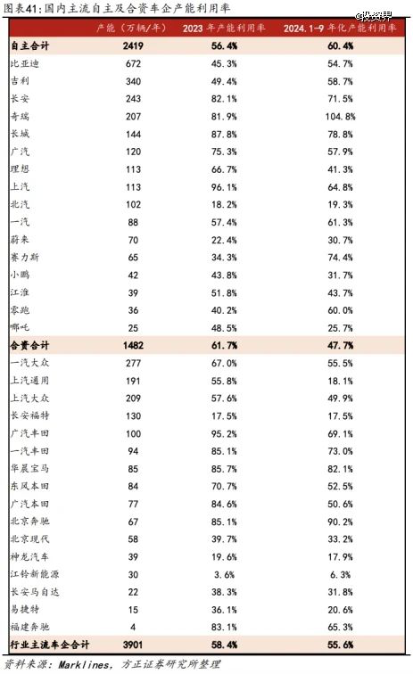 另据方正证券研究所统计,国内主流自主及合资车企,2024年1-9月的年化产能利用率只有55.6%,即使考虑到4季度为传统的销售旺季,这个利用率也不大会超过60%。